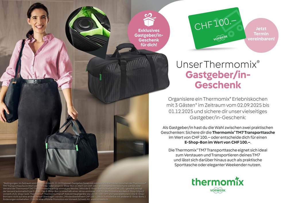 Als Gastgeber/in erhältst du vom 02.09. - 01.12.25 als Dankeschön den die Vorwerk Gerätetasche (auch als Sporttasche oder Weekender nutzbar) im Wert von Fr. 100.- oder einen e-Shop Bon im Wert von Fr. 100.- für nützliches Zubehör, wie z.B. die 6in1-Reibe, die ab sofort im Shop bestellbar ist. Sichere sie dir somit zum halben Preis!