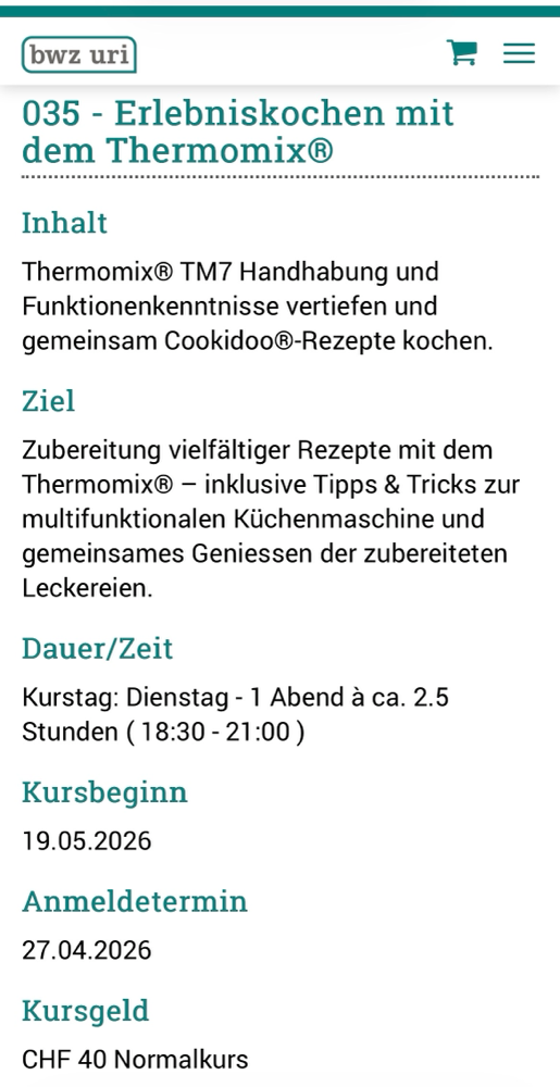 Nach den erfolgreichen Cookidoo®-, Mitbringsel- und Geschenke-Kursen biete ich am Dienstag, 19. Mai 2026 in Zusammenarbeit mit dem BWZ Uri an der Bauernschule in Seedorf einen weiteren Kurs „Erlebniskochen“ an. Anmeldung via diesen Link - ab sofort offen.